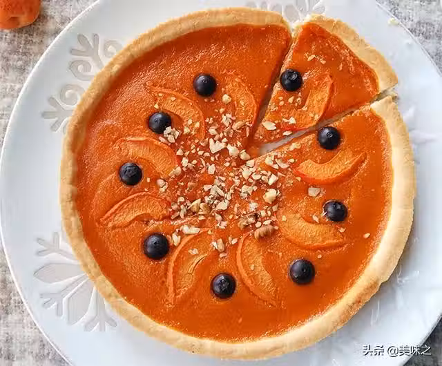 10、倒入杏子醬,擺放杏子片和藍莓,撒少許核桃碎。