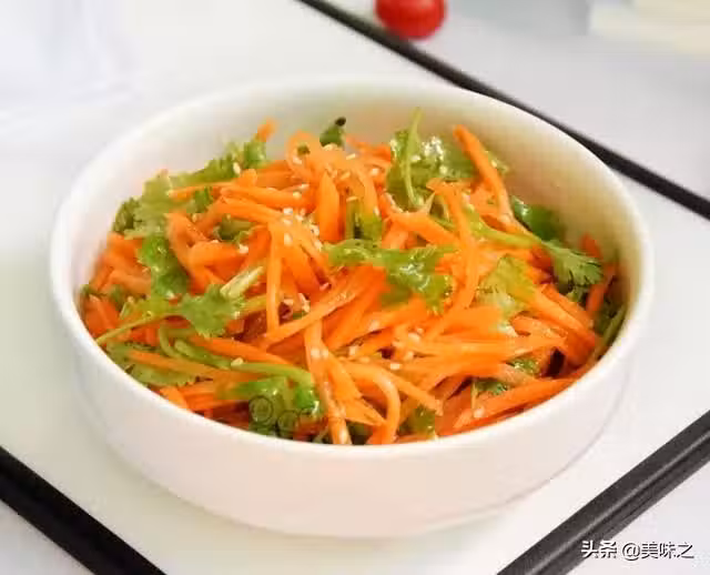 胡蘿蔔2根、香菜3棵、熟白芝麻適量、砂糖5克、醋1小勺、鹽適量、油適量。