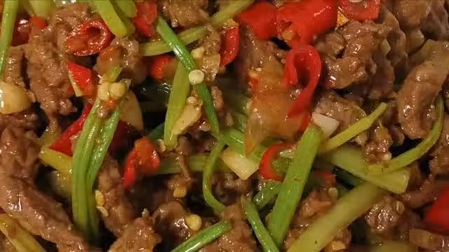 做法:將牛肉洗凈,切成薄片備用。青椒、紅椒去籽切成小塊,洋蔥切成丁,姜切成片,蒜切成末備用。熱鍋涼油,放入牛肉片,中小火慢慢煎,煎至兩面金黃色,加入洋蔥丁、薑片、蒜末炒香。加入料酒、生抽、老抽、鹽、白糖翻炒均勻,加入青紅椒塊,大火翻炒均勻即可。