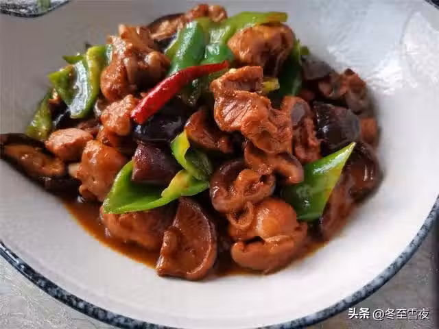 【家常黃燜雞】所需材料:雞腿2個、香菇500克、尖椒2個、黃豆醬100克、油鹽適量、蔥1段、姜1塊、大蒜2瓣、花椒10幾粒、大料1個、料酒1湯匙、生抽1湯匙、白糖半湯匙、