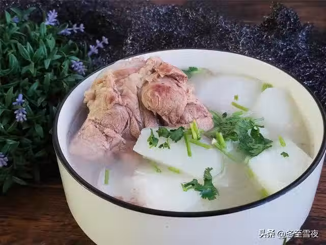 5.到時間後,下入白蘿蔔,加入鹽調味,大火燒開,轉中小火煮20分鐘左右,把白蘿蔔煮至透明變軟糯,關火,加入白鬍椒粉攪勻,撒上香菜末,一道營養滋補的白蘿蔔大骨湯就做好了。
