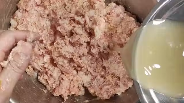 6.一直攪拌至肉餡可以用手抓起來粘住手,然後成團緩慢的滑下去就可以了,此時的肉餡已經充分攪打上勁。