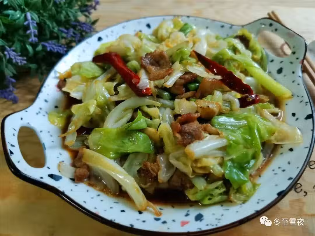 【五花肉炒包菜】所需材料:包菜半棵、去皮五花肉100克、油鹽適量、大蒜2瓣、花椒10幾粒、干辣椒4-5個、生抽1湯匙、米醋半湯匙、料酒半湯匙、蚝油半湯匙、