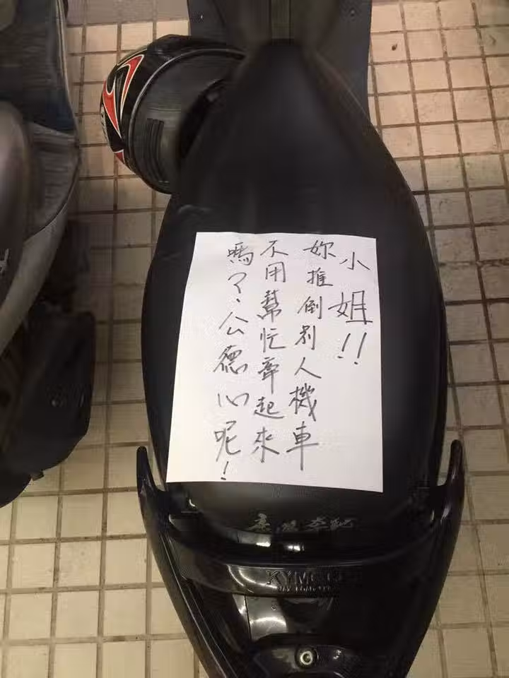 沒想到隔天這張字條卻跑到他的白色機車上,還多了幾行回覆的字:「抱歉,力氣不夠,旁邊也沒有人能幫忙」一副錯不在我的態度,讓他氣壞了反問:「如果是妳的機車倒了,你會丟著他在路邊不管直接離開嗎?」氣不過的他選擇到臉書爆料公社發文還原事情始末,希望能討回一個公道!