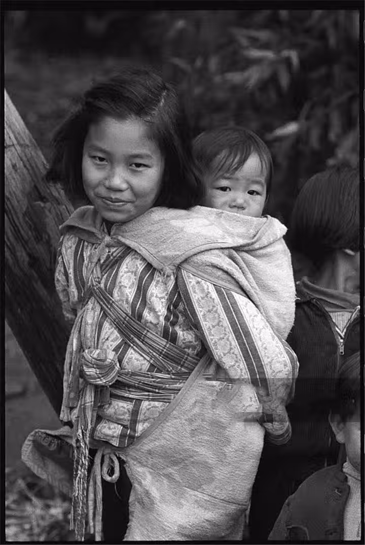 7、一位姐姐背著小弟弟,對著鏡頭淺笑,含蓄中幾分溫柔。由於一般家庭子眾多,通常較大的孩子肩負照顧弟妹的責任,女孩子被賦予母親的角色,背著幼小的弟妹,四處可見。