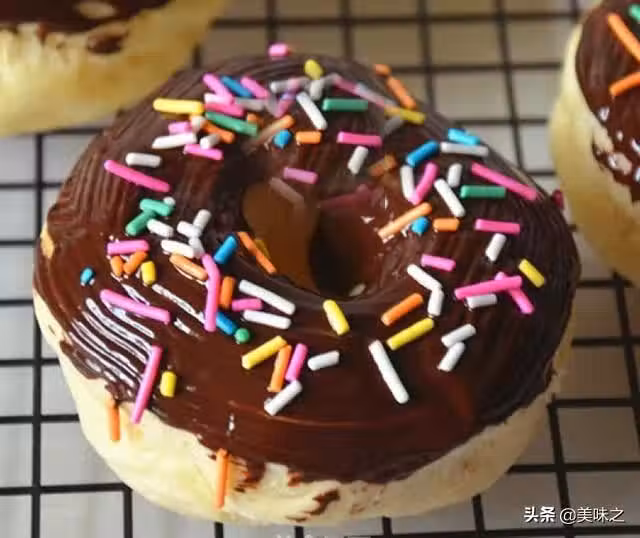12、甜甜圈的小圓心,每兩個用牙籤串起來,也刷上巧克力,撒上巧克力糖針。的。
