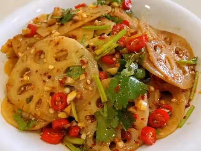 食材:蓮藕、蒜、蔥、小米辣、白芝麻、辣椒粉、生抽、老抽、陳醋、蚝油、白糖、香菜