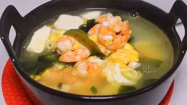 起鍋燒油,少許蔥花,薑片爆出香味,放入蝦仁炒至變色,加入裙帶菜再倒入適量開水,豆腐加入,開大火煮沸騰。
