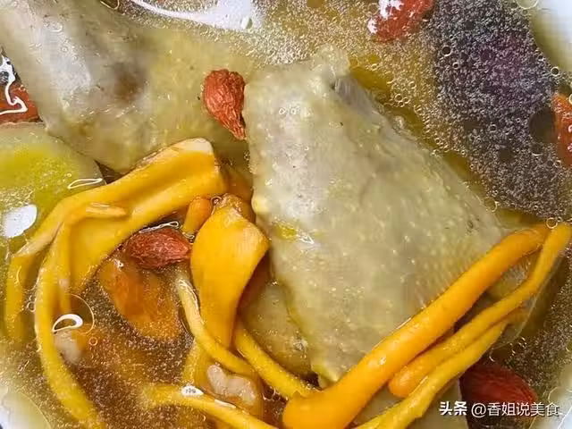 2、蟲草花提前浸泡,泡發後清洗乾淨。將鴿子、蟲草花、紅棗和薑片放入湯鍋中,加入足量的清水,蓋上蓋子燉煮兩個小時。