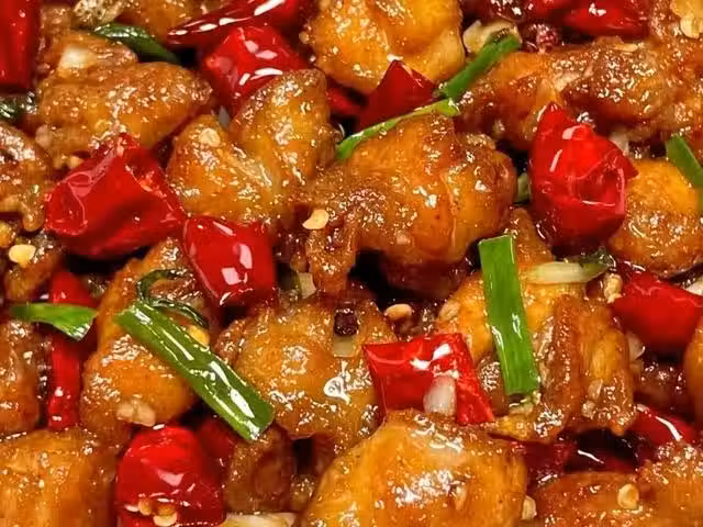 3、鍋留底油,放入蒜末、干辣椒和花椒炒香,再放入炸過的雞腿肉翻炒均勻。