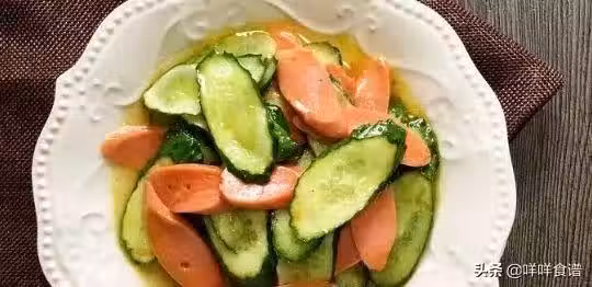 1.火腿腸切片,黃瓜切片放碗里,加入1茶匙鹽,抓勻,腌制一會兒,將腌出來的水倒掉