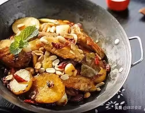 3、炒鍋熱油後下雞翅和土豆條,至土豆和雞翅略微焦黃完全成熟,再下藕片翻炒。下花椒和干辣椒抄香,再下香辣醬,最後講調料汁倒入,抄到濃稠收汁即可。