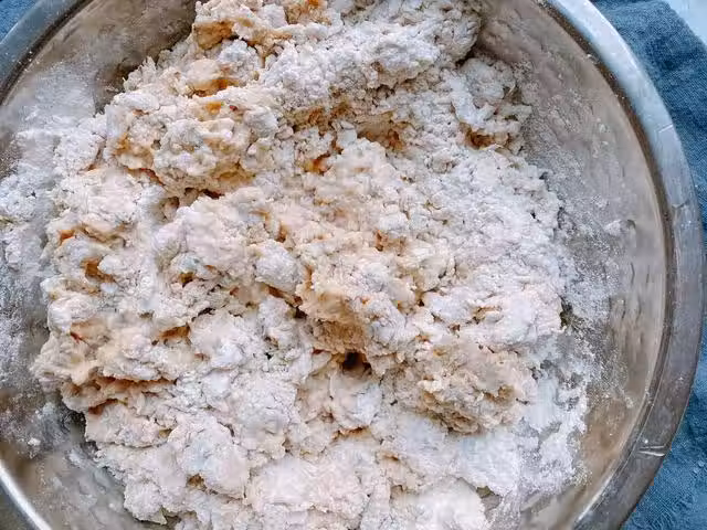 4、揉成團之後,表面是很粗糙的,這時候需要多揉一會,像搓衣服一樣將麵糰往外搓,大約需要揉面10-15分鐘,因為這裡採取的是一次發酵法,想要麵包細膩柔軟,揉面這一步必不可少,可以多揉一會。
