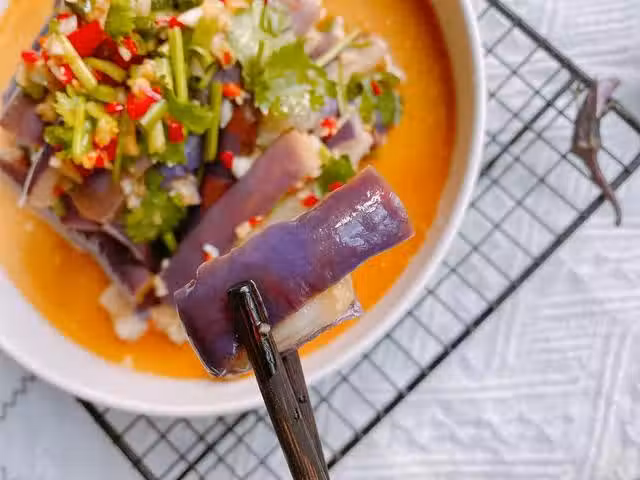 【原材料】茄子、大蒜、小米辣、生薑、白醋、食鹽、生抽、雞精、食用油;