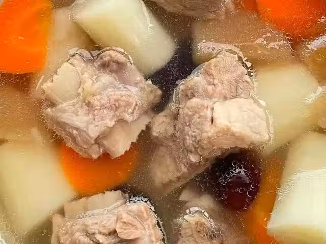 3、把排骨、胡蘿蔔、山藥、薑片先倒入湯鍋中,加入足量的清水,蓋上蓋子燉煮半個小時。