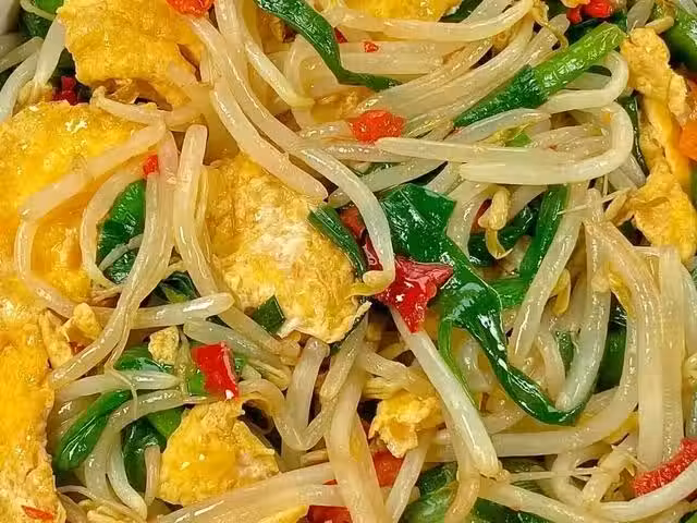 1、綠豆芽清洗乾淨,韭菜洗凈後切成小段。雞蛋打入碗中攪散備用。