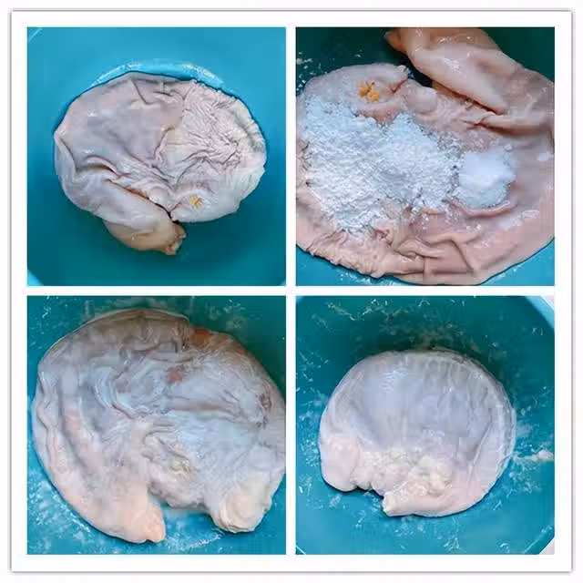 3、雞肉和豬肚都處理好之後,將雞肉裝進豬肚中,下面可以用牙籤封口,再準備稍微多一點的生薑和白鬍椒,生薑去腥,白鬍椒想要香味濃郁一些的,可以將它放在鍋中翻炒一下,並且碾碎,這樣燉湯的時候香味和辛辣味都會更濃郁,覺得麻煩的可以省略。