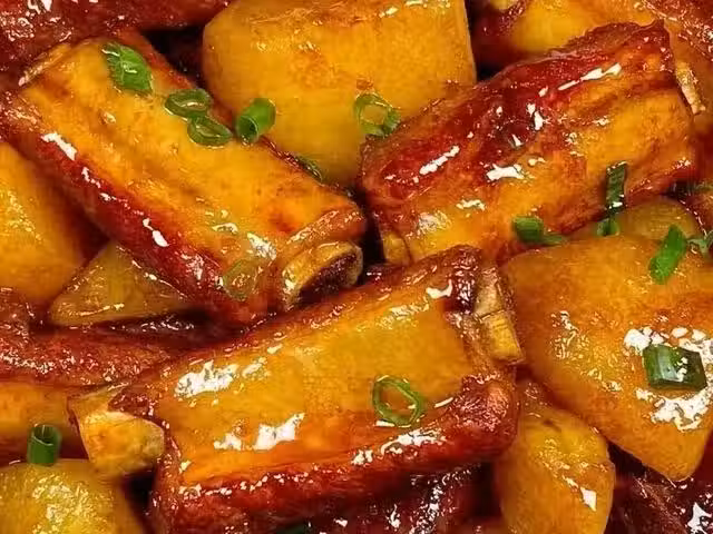 準備食材:排骨,土豆,蔥段,薑片,冰糖,蔥花。
