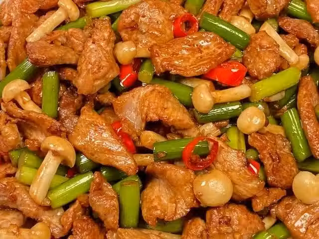 4、然後放入蒜苔和菌菇翻炒均勻,炒至入味即可出鍋裝盤開吃。