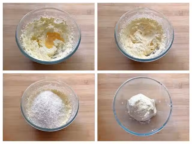第三步:餡料部分製作好之後,將麵包麵糰需要的材料分別都稱重好,將粉類放入揉面盆中,用蛋抽或者其他工具混合均勻,然後加入液體混合揉成麵筋形成,能拉出比較厚的膜即可。