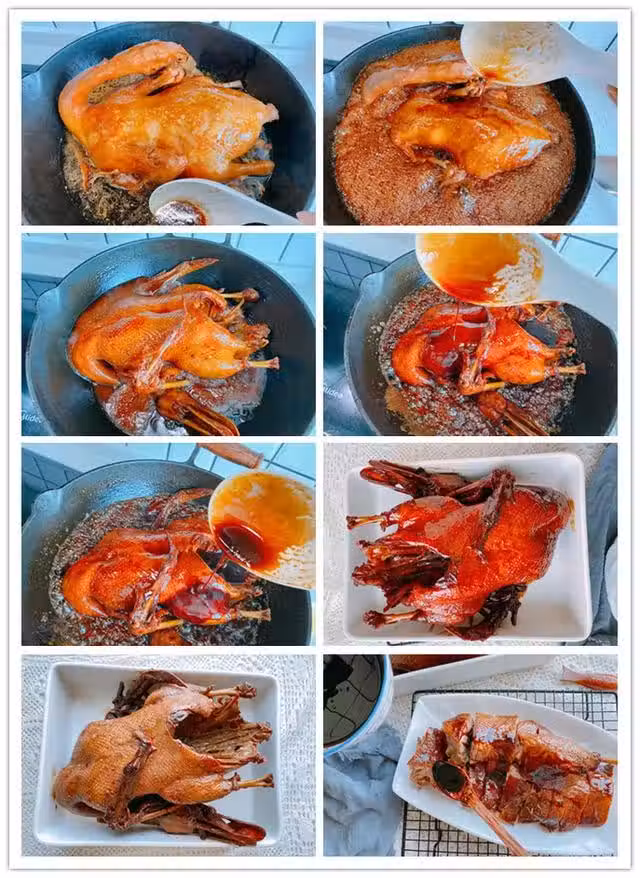 8、鴨子斬好之後,裝盤,裝盤再淋上一些滷鴨子的醬汁,晶瑩紅亮的醬汁澆在肥厚的鴨肉上,看上去紅光油亮的,讓人食慾大開,入口是油潤酥爛的,醬香濃郁,吃完唇齒留香;