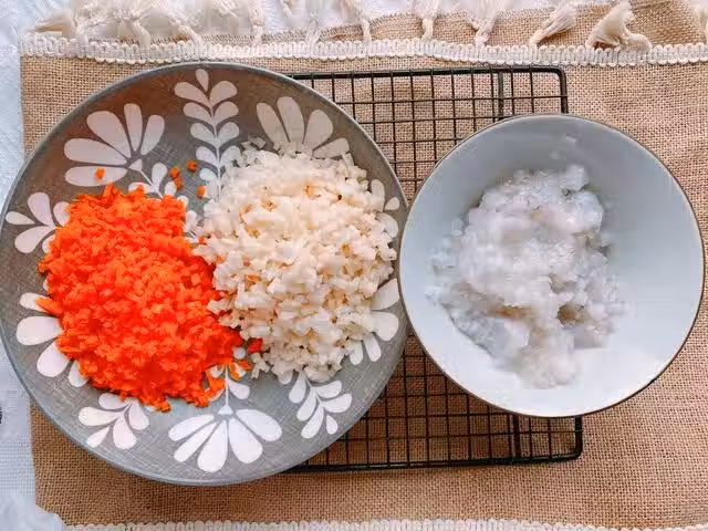 3、將藕丁、胡蘿蔔丁、蝦泥放在一個大盆中,先攪拌均勻,攪拌均勻之後開始調味,加一個蛋清、一勺食鹽、胡椒粉攪拌均勻,最後加少許澱粉,攪拌均勻,澱粉能起到更好的粘合作用,多攪拌一會,攪拌至上勁的狀態,後續更好成型。