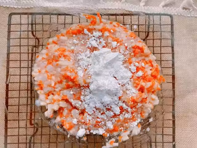 4、蝦仁蓮藕餡調好之後,取大約50g一個,大約能分成8個,取好餡料,放在手上,團成圓餅,放在鍋中煎,在煎藕餅的過程中一定要小火慢慢煎,這也是之前要將胡蘿蔔和蓮藕切得碎一些的原因,更容易煎熟,兩面定型之後勤翻面,這樣才能將食材完全煎熟且表面不會煎焦;