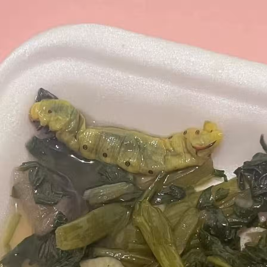點燙青菜見「粗大毛毛蟲」橫躺餐盒裡!網友「見1亮點」崩潰:要吐了