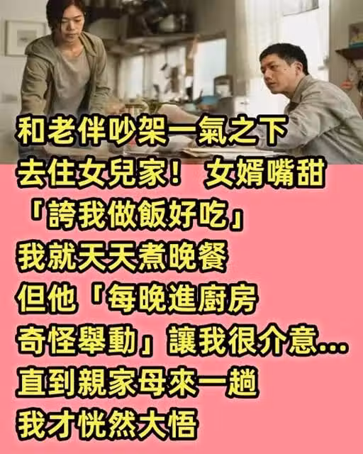 和老伴吵架一氣之下去住女兒家! 女婿嘴甜「誇我做飯好吃」我就天天煮晚餐,但他「每晚進廚房奇怪舉動」讓我很介意…直到親家母來一趟我才恍然大悟!