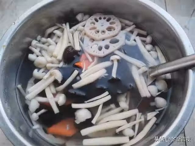 5.把海鮮菇,木耳,藕片和胡蘿蔔一起撈出,瀝凈水分待用。
