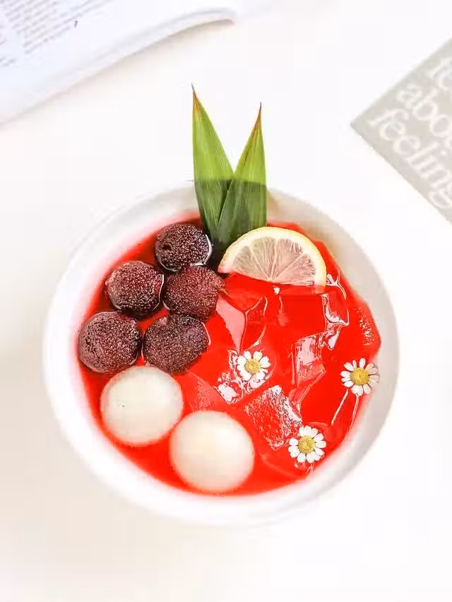 5.加入楊梅+荔枝,用斑斕葉、檸檬片裝飾一下即可