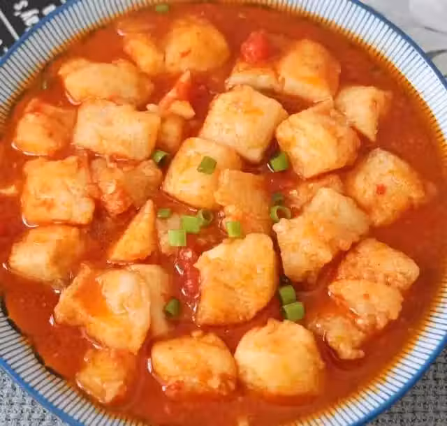 (1)龍利魚處理清洗乾淨切塊,番茄用鹼面洗凈切塊,小蔥剝皮切蔥花備用。