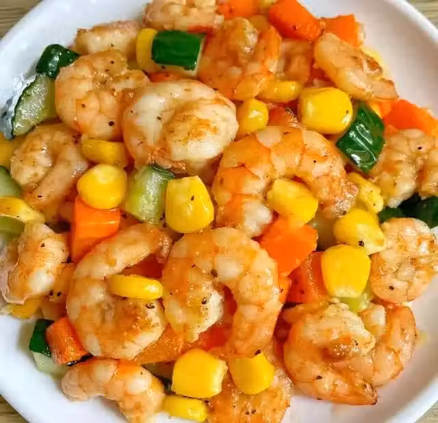 (5)鍋底留油爆香生薑蒜末,下入黃瓜、胡蘿蔔、玉米粒翻炒至斷生。