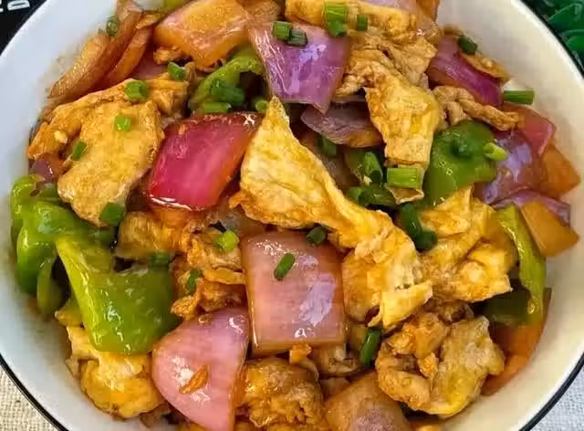 1、準備食材:洋蔥、雞蛋、青椒、白砂糖、小蔥、生抽、老抽、蚝油、食鹽