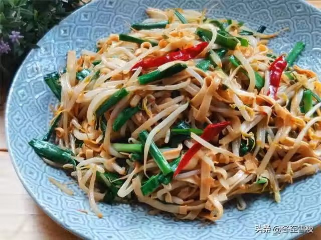 【素炒三絲】所需材料:綠豆芽半斤、干豆腐2張、韭菜1把、油鹽適量、姜2片、干辣椒3-4個、醬油1湯匙、陳醋半湯匙、雞精1茶匙、