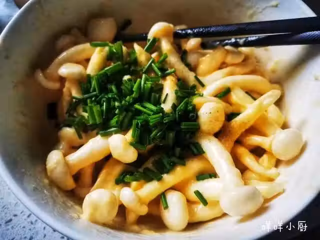 5、平底鍋中刷上一層油,將拌好的白玉菇糊糊平鋪到鍋中,中火煎到底部金黃表面定型。