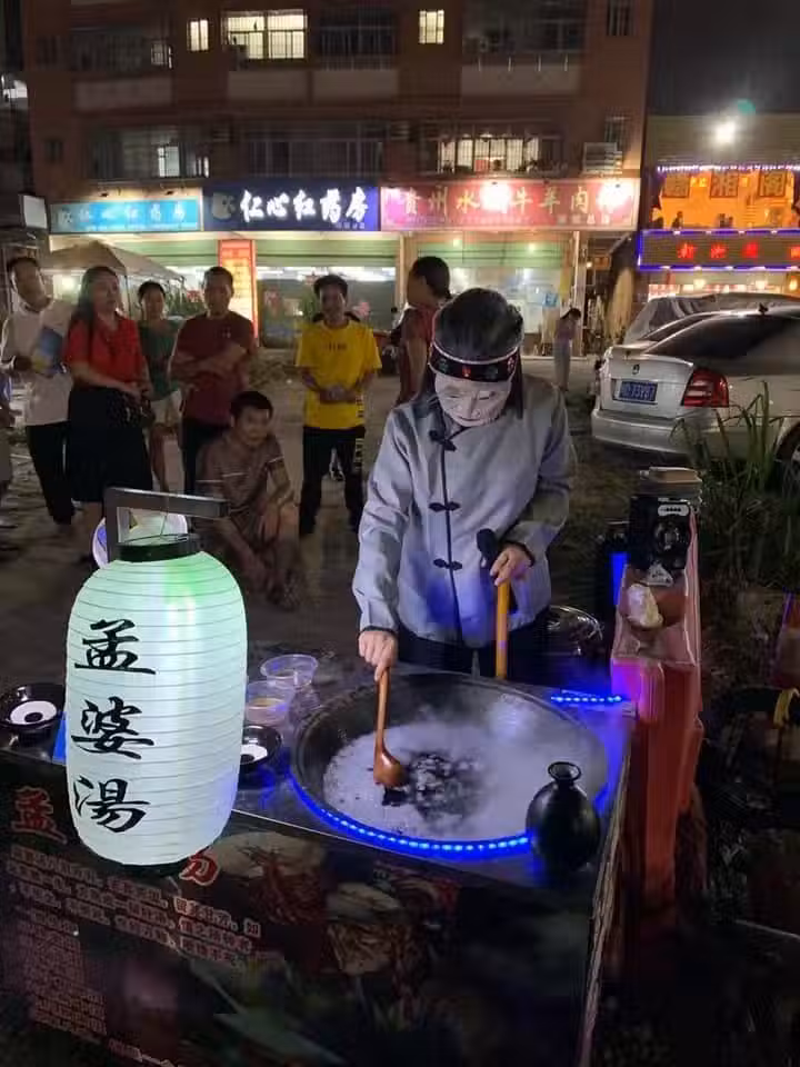 據《三立新聞網》報導,這個神奇的孟婆湯,居然直接在夜市出現了!就有網友在臉書社團「爆廢公社」發文說,同事在廈門工作的時候,逛了一下當地的夜市,赫然發現有一名戴著面具的人,正在煮個一鍋濃厚又冒著白煙的東西,仔細一看,掛著的招牌燈籠上面斗大的三個字寫著「孟婆湯」,釣出一票網友討論。