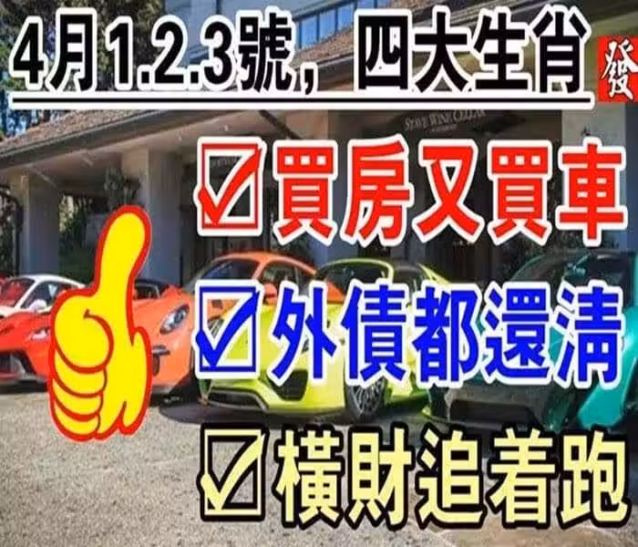 4月1.2.3號買房又買車,橫財追著跑,註定將來必成大器,鈔票多多。