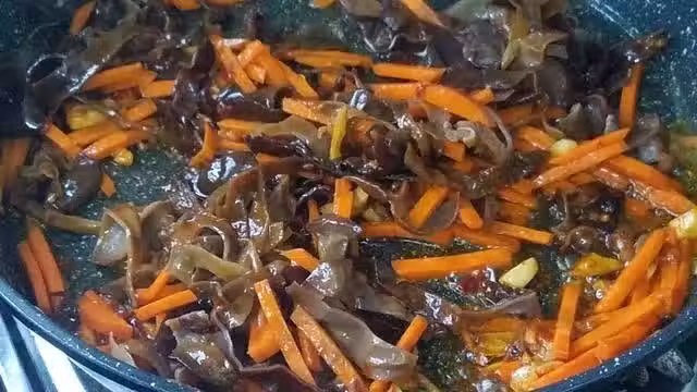 7.木耳胡蘿蔔翻炒一分鐘後,把豆腐放進鍋里,然後把調好的醬汁也倒進去,蓋上蓋子小火燜個4-5分鐘。