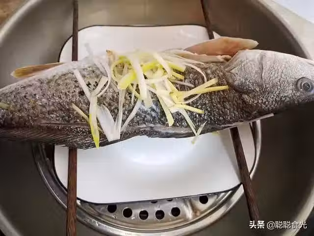 第四步:在盤子上面放兩根筷子,把魚放在筷子上面,可以在魚身上抹一層油鎖住水分,讓魚肉口感更鮮嫩,再放上一些腌魚的蔥薑絲,然後蓋上鍋蓋,水開後蒸10分鐘左右,魚肉顏色變白,從後背的劃痕看進去沒有血絲,魚肉基本就蒸熟了。