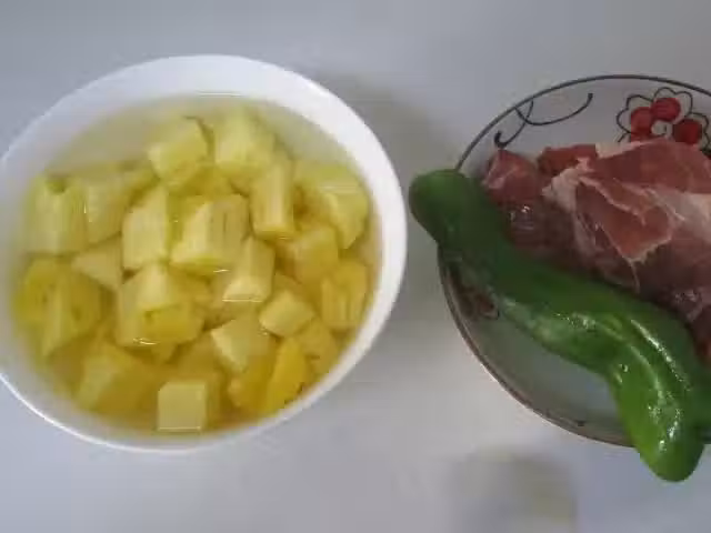 菠蘿切小塊後泡入淡鹽水裡5分鐘後撈起備用,備好豬梅肉,青椒
