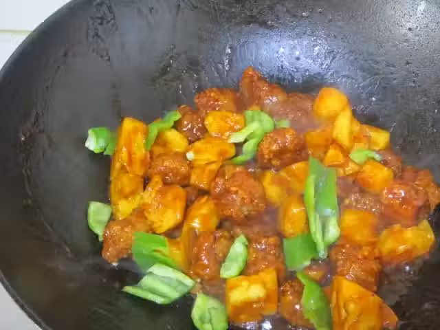 最後把肉和菠蘿回鍋翻炒至汁水收干倒入清炒翻炒均勻後熄火出鍋