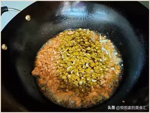 接下來先把酸豆角倒入鍋裡面,過熱油翻炒一會,炒香後倒入河粉拌均勻,