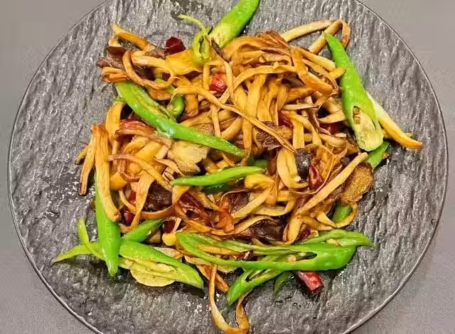 食材:新鮮茶樹菇、青椒、干辣椒段、大蒜、醬油、白糖