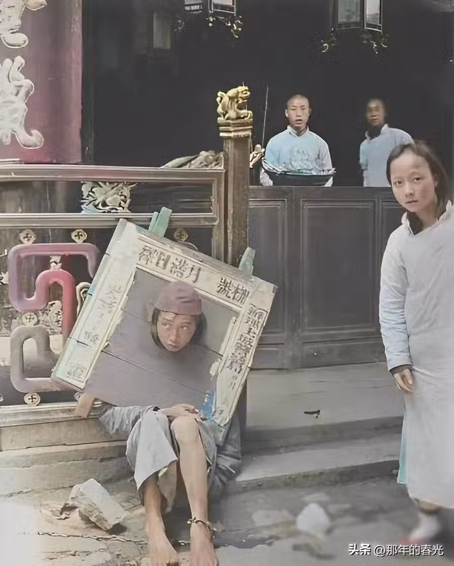 一個偷了店鋪里商品的小賊在被人們抓到以後送到了官府,而官府為了警示其他人,把他戴上枷鎖和腳鐐拴在了店鋪的門前示眾,看到有人給他拍照片,店鋪里的夥計和路人紛紛好奇的看了過來。