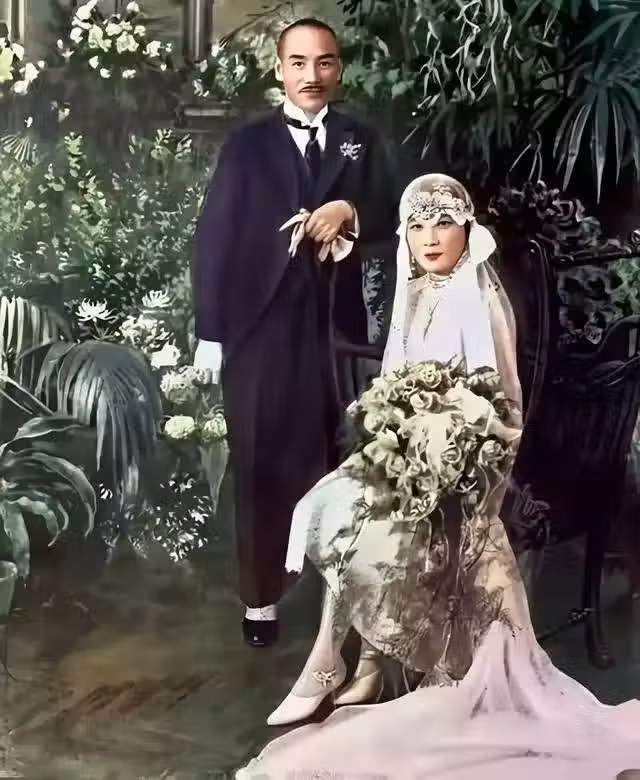1927年,宋美齡和蔣介石的結婚照片。這年宋美齡30歲,蔣介石40歲,宋美齡身穿白色婚紗,優雅漂亮,蔣介石身穿西裝,表情看上去有些滑稽。