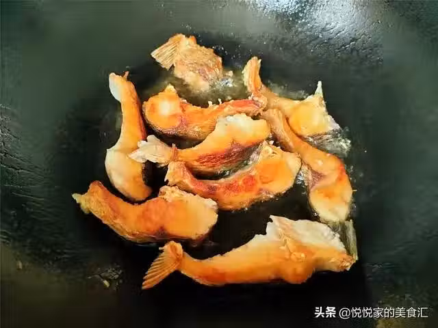 煎至一面金黃後翻面,把另一面也煎至金黃,注意在煎魚的時候不要頻繁地去翻動,只要晃動鍋子,讓魚肉受熱均勻就可以了,魚肉全部煎好之後夾出來放在一邊。