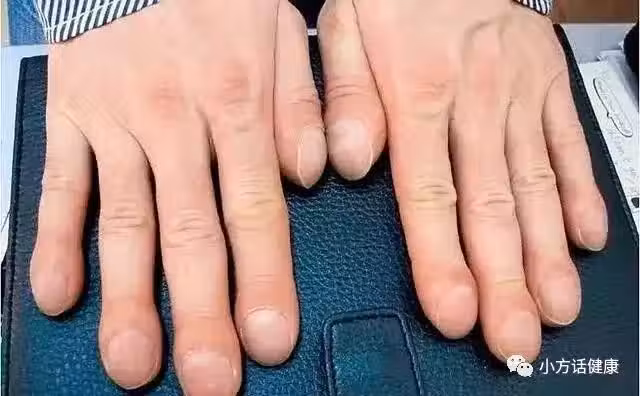 手指凸起,由於肺部病變,腫塊堵塞氣道,引起了手指的長期缺氧和內分泌紊亂,從而出現手指末端異常的組織增生。