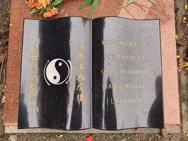 李國豪的墓誌原本是準備在婚禮上宣讀的。反觀李小龍墓地,墓碑是絳紅色大理石,上方鑲嵌著李小龍照片和李小龍中英文名、生卒年。在覆蓋墳冢的大理石上鑲嵌著翻開書籍形狀的黑色石刻,上面刻著陰陽魚太極圖,左側刻著兩句話12個漢字:以無法為有法,以無限為有限。右側則是英文翻譯:Your inspiration continues to guide us toward our personal liberation。