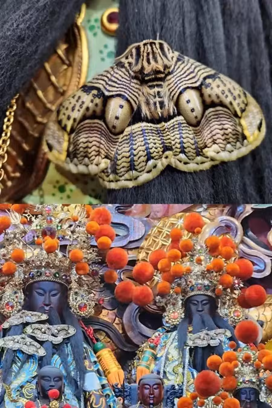 據《自由時報》報導,受鎮宮主委黃國欽介紹,這次驚喜發現有7隻枯球籮紋蛾飛進廟裡,